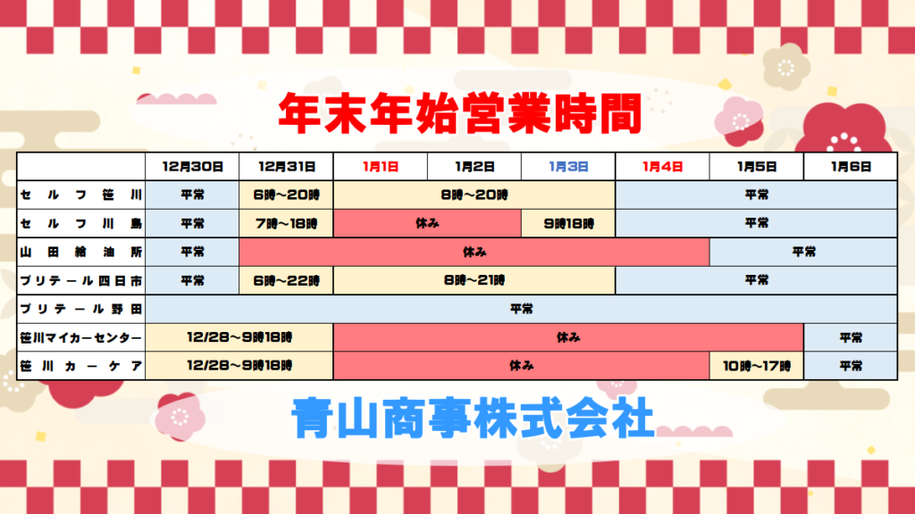 いつもご利用ありがとうございます。 本年の営業は27日で終了いたしました。来年は6日からの営業となります。 タイヤ交換やオイル交換などの軽整備に関しては31日までの営業となります。 年末年始少し営業時間が変わりますのでご確認の上ご来店ください。